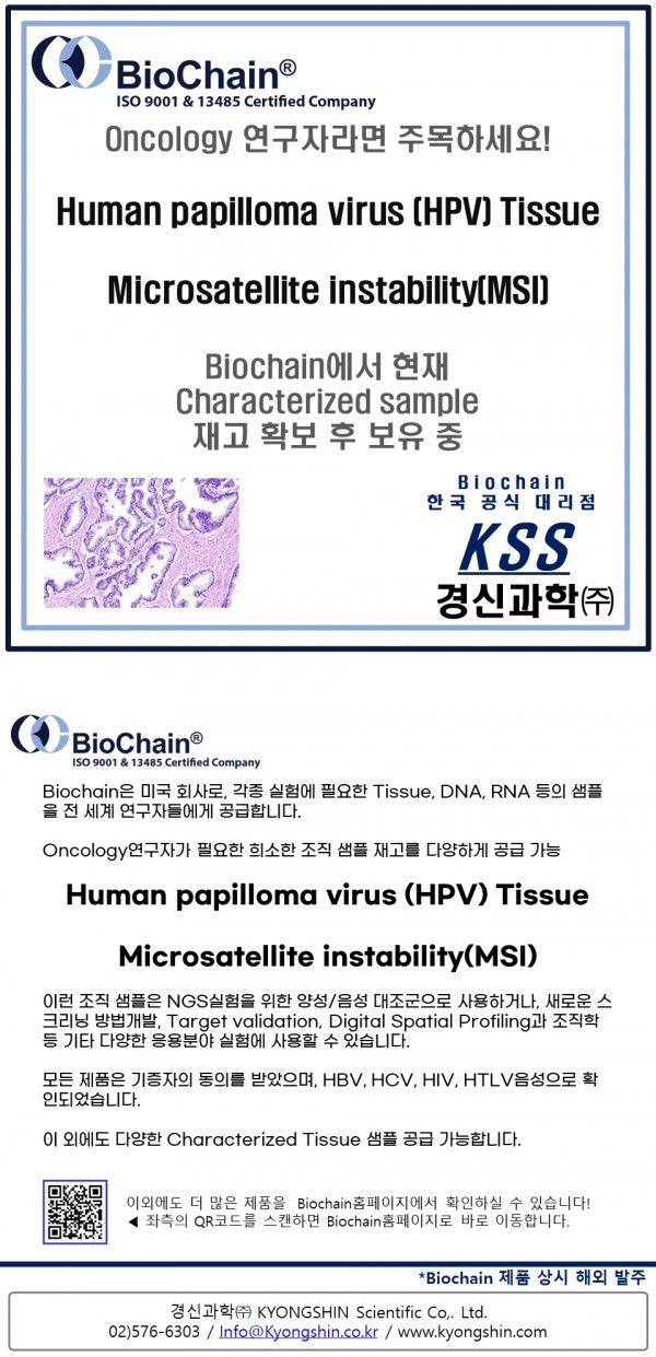 Biochain] Human papilloma virus (HPV) TissueMicrosatellite instability(MSI) 재고 다량 확보! Oncology연구자라면 Biochain!