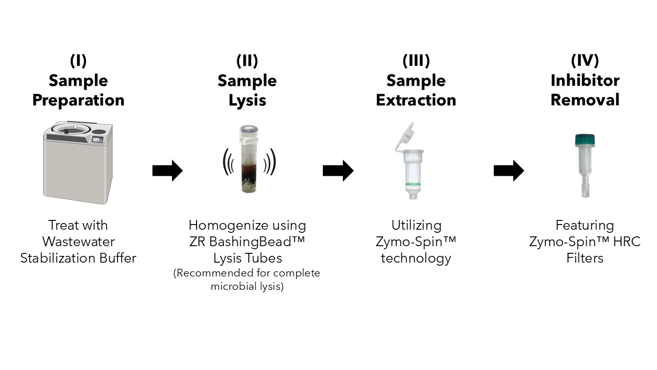 The Quick-DNA/RNA™ Water Kit provides inhibitor-free nucleic acid isolation from large volume water samples. Up to 50 mL of raw wastewater or 1 L of low-biomass water samples can be processed in a single preparation. The kit features a specialized Wastewater Stabilization Buffer that concentrates viruses, microbes, and free nucleic acids, eliminating the need for vacuum filtration. With cutting-edge inhibitor removal technology, the Quick-DNA/RNA™ Water Kit ensures robust recovery and purification of DNA/RNA, making it ideal for sensitive downstream applications such as ddPCR, RT-qPCR, and NGS.
