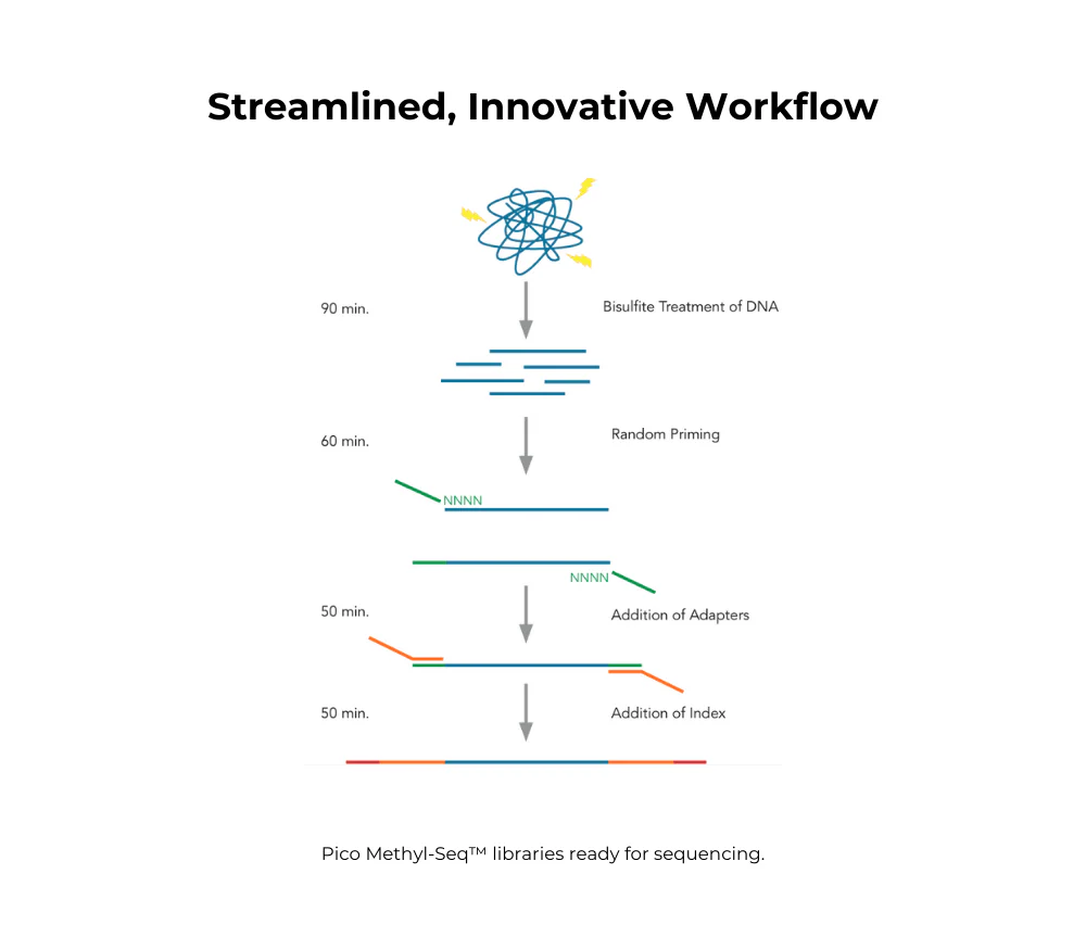 The Pico Methyl-Seq Library Prep Kit provides a streamlined workflow for making WGBS libraries. Input DNA is randomly fragmented during the initial bisulfite treatment step followed by three rounds of amplification with uniquely designed primers. The procedure can accommodate as little as 10 pg input DNA (including that derived from FFPE samples), making it ideal for methylation analysis of precious, limited, and target-enriched samples.