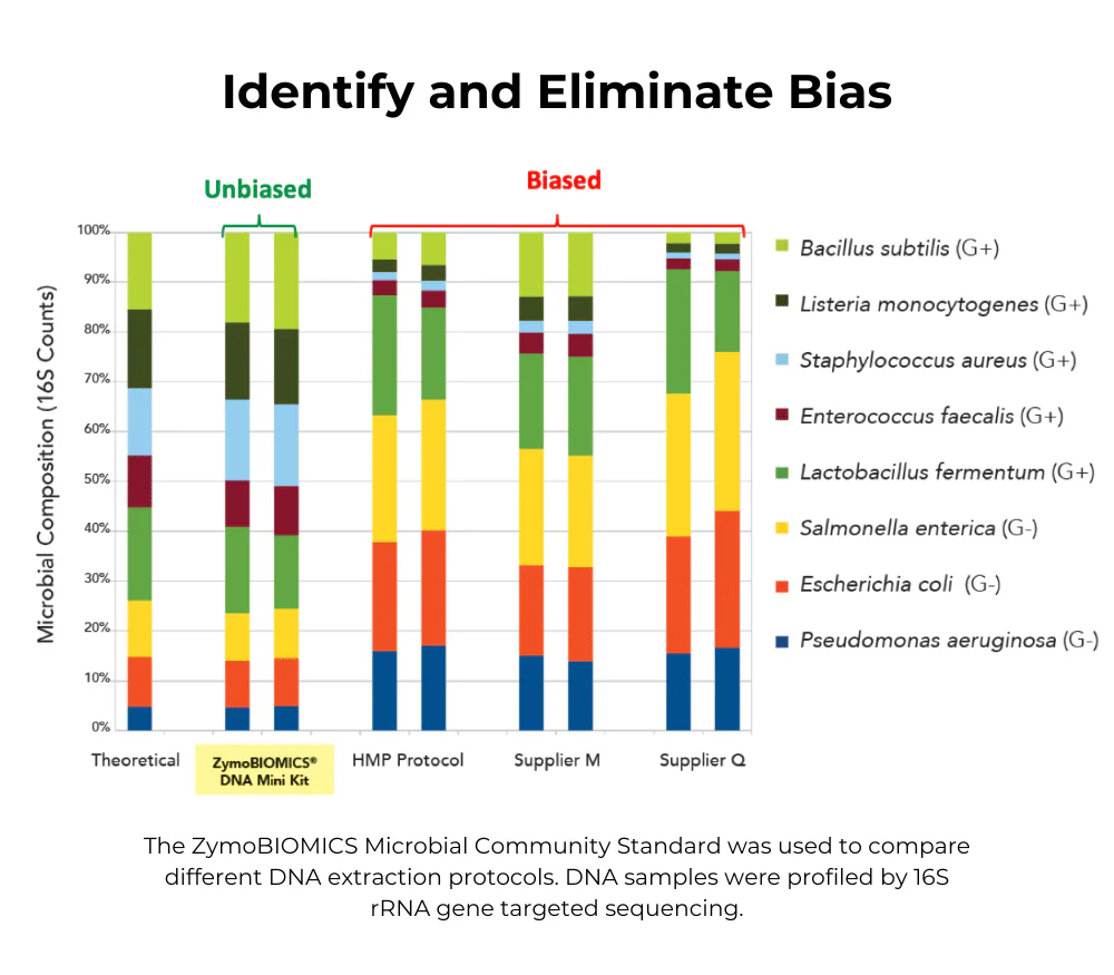 Microbial composition profiling techniques powered by Next-Generation sequencing are becoming routine in microbiomics and metagenomics studies. However, these analytical techniques can suffer from significant bias from collection to analysis. The ZymoBIOMICS Microbial Community Standard is designed to assess bias and errors in the extraction methods of a microbiomics workflow. The Microbial Community Standard mimics a mixed microbial community of well-defined composition, containing three easy-to-lyse Gram-negative bacteria, five tough-to-lyse Gram-positive bacteria, and two tough-to-lyse yeasts. Acting as a defined input from the beginning, the Microbial Community Standard can guide construction and optimization of entire workflows and can also be used as a routine quality control. Theoretical Composition Based on Genomic DNA: Listeria monocytogenes - 12%, Pseudomonas aeruginosa - 12%, Bacillus subtilis - 12%, Escherichia coli - 12%, Salmonella enterica - 12%, Lactobacillus fermentum - 12%, Enterococcus faecalis - 12%, Staphylococcus aureus - 12%, Saccharomyces cerevisiae - 2%, and Cryptococcus neoformans - 2%.